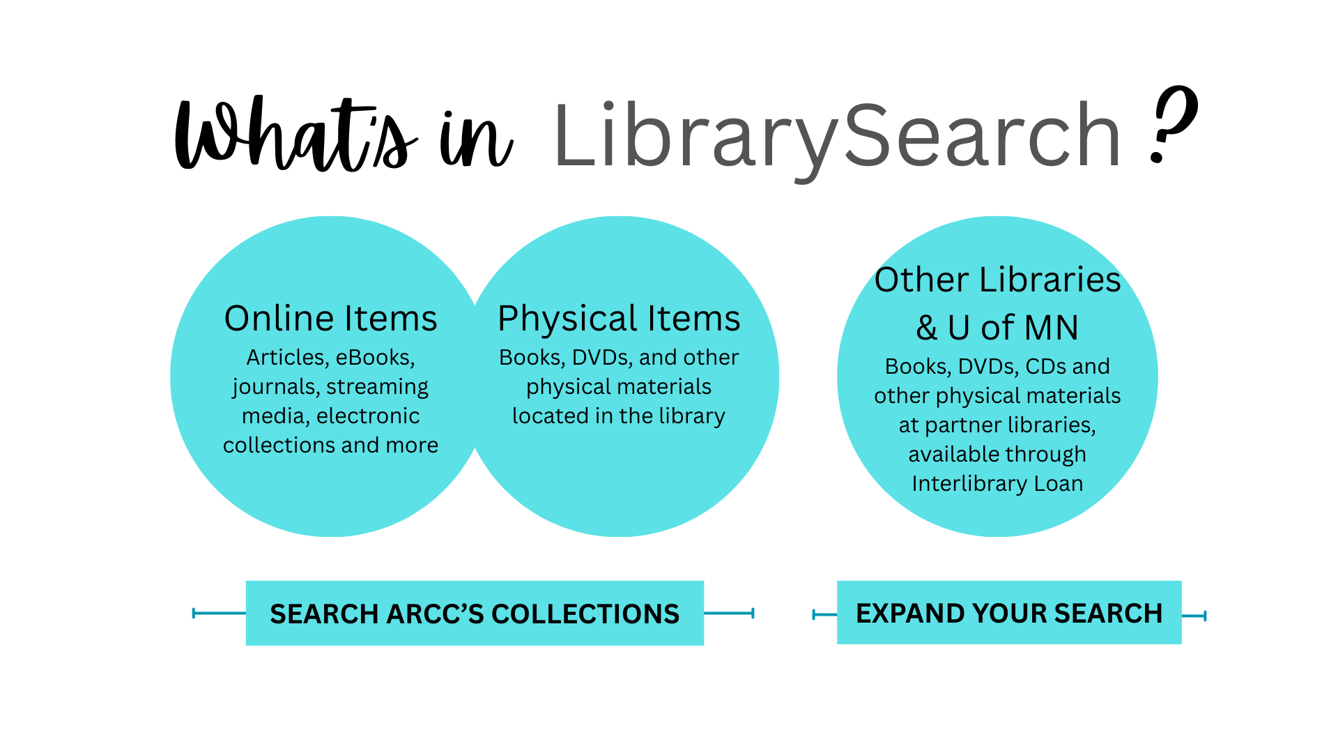 LibrarySearch is the library's searching tool to locate books, ebooks, articles, videos, and more provided by the campus libraries, with options to search more widely in other institution libraries.